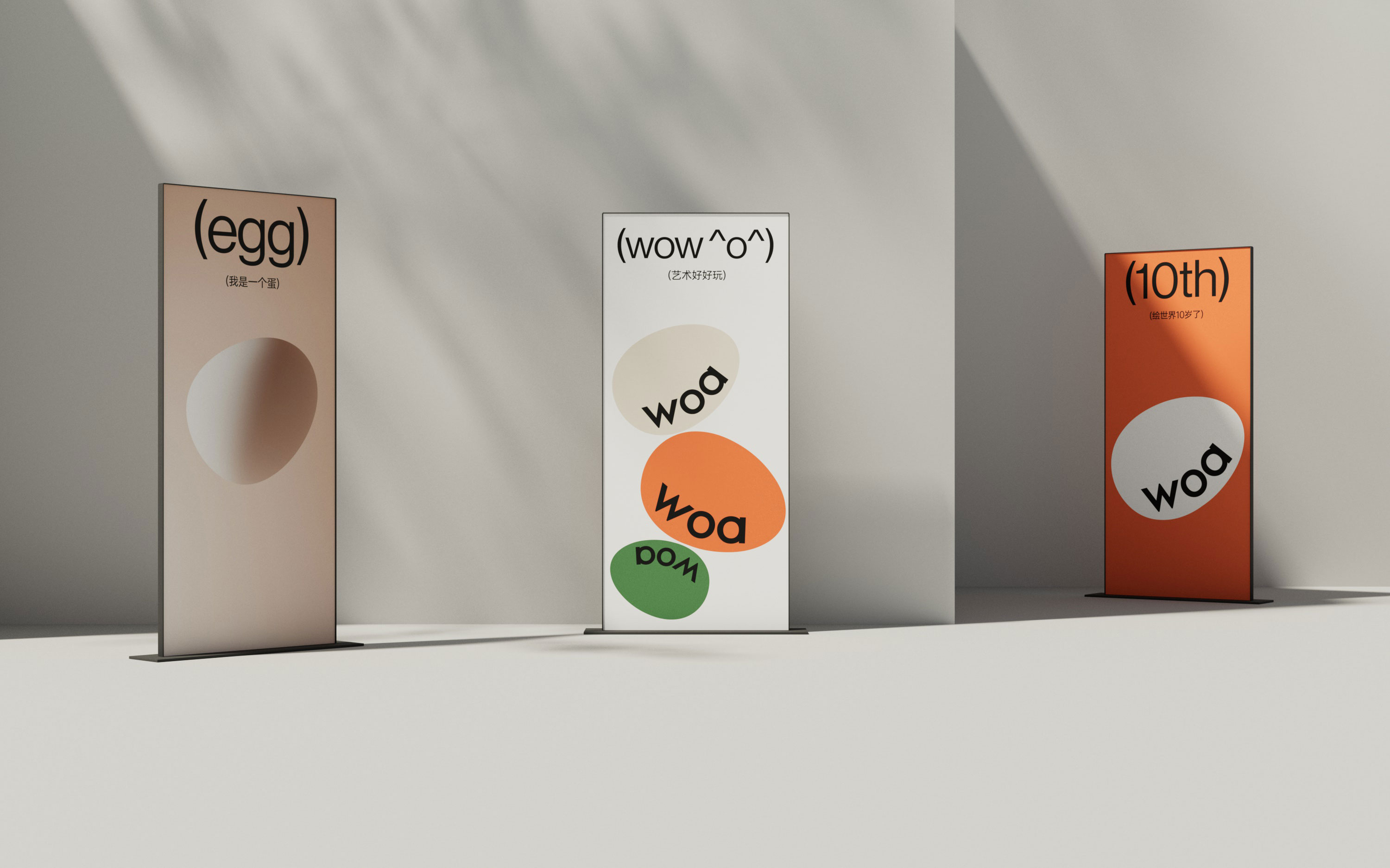 WOA绘世界以「启蒙你的艺术人生」为口号,通过专业的美术教育、策展服务和艺术商店,致力于用艺术丰富每一个人的生活。WOA提供面向全年龄段的系统美术课程,既有启发孩子们创造力的课程,也有陪伴成人实现艺术梦想的课程。WOA定期举办主题深度的艺术展览,让艺术家的精神世界通过作品展现。迈入第十个年头,WOA绘世界为庆祝这一里程碑,决定找到RDA进行品牌的升级。这次升级,我们从一个看似简单却包含深意的概念开始——蛋。在我们看来,这个概念不仅象征着孕育艺术的智慧,也体现了WOA绘世界一直秉持的原则——不忘初心,回归艺术的本性。我们通过重新设计,将这一象征融入品牌,以此传达WOA绘世界始终保持的艺术热情和教育理想。重塑后的WOA,将继续致力于将艺术带到更多人的生活中。
